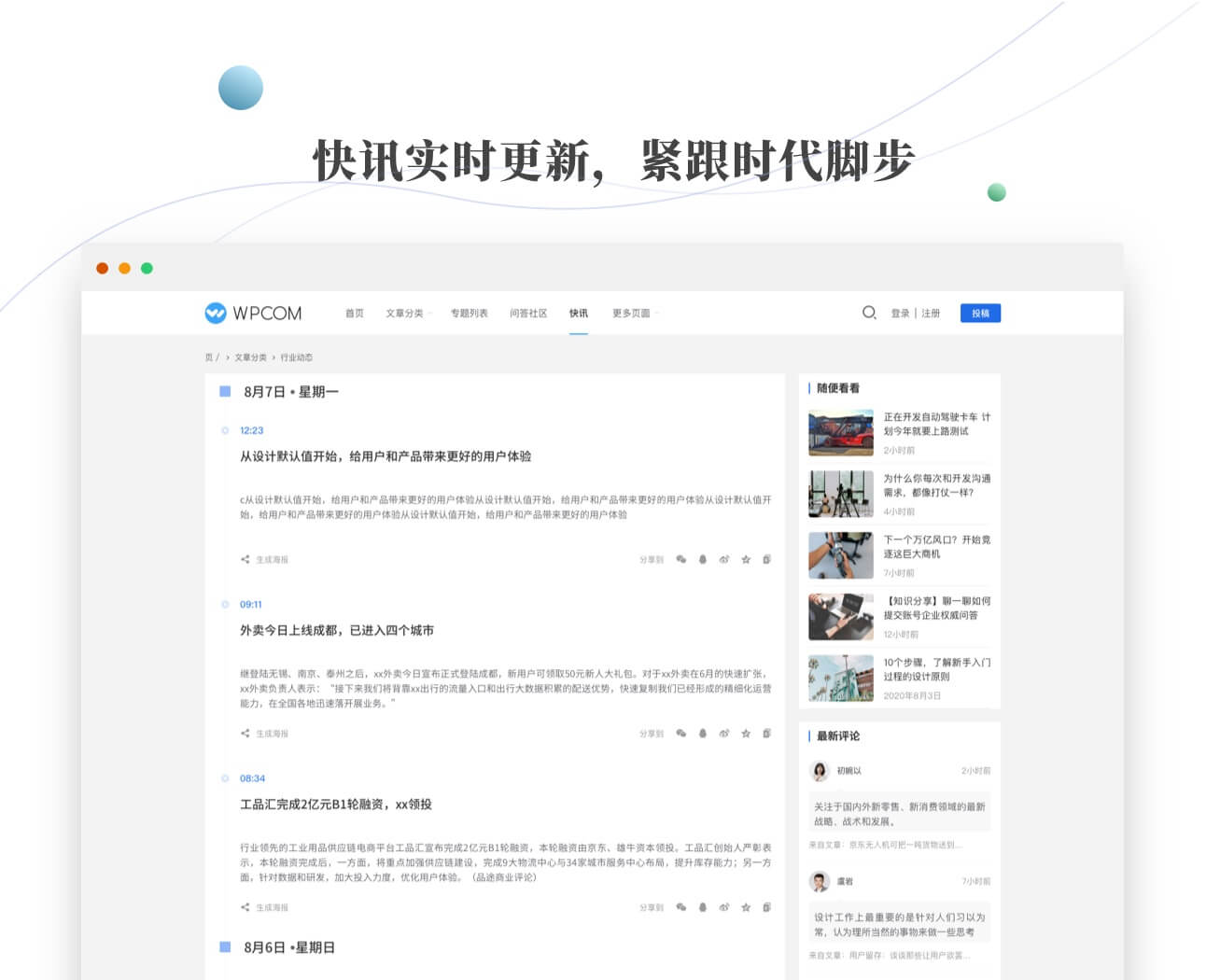 JustNews主题专为博客、自媒体、资讯类的网站设计开发,自适应兼容手机、平板设备,支持前端用户中心,可以前端发布/投稿文章,同时主题支持专题功能,可以添加文章专题。